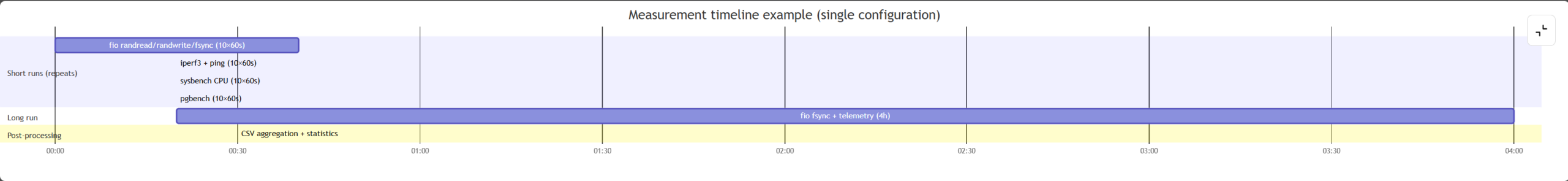 - Long runs: 1–6 hours, recommended 4 hours, tracking time series of p99 and system metrics.